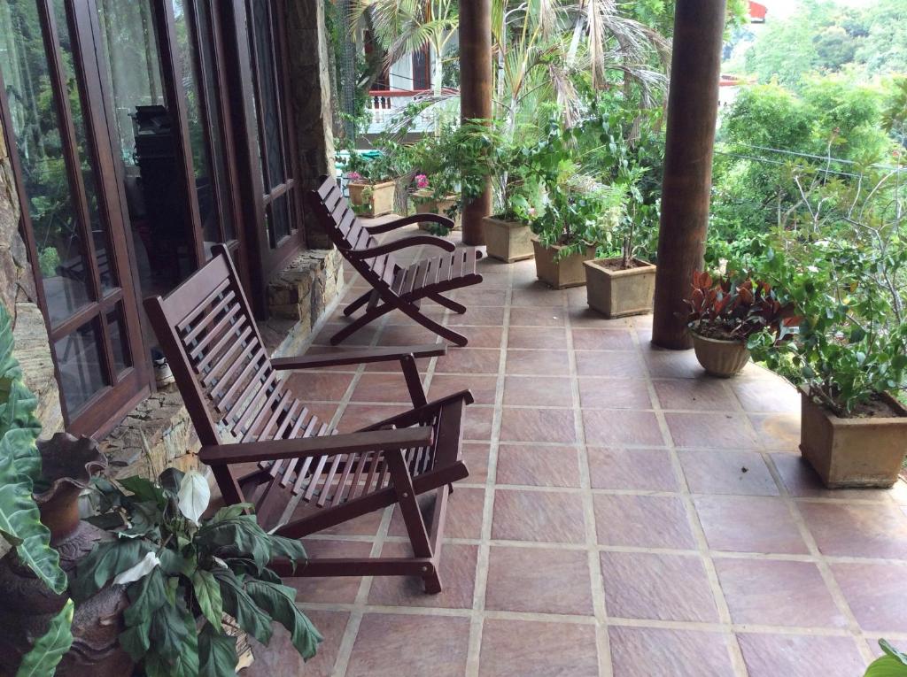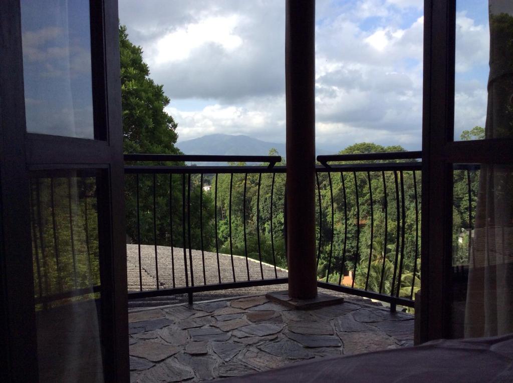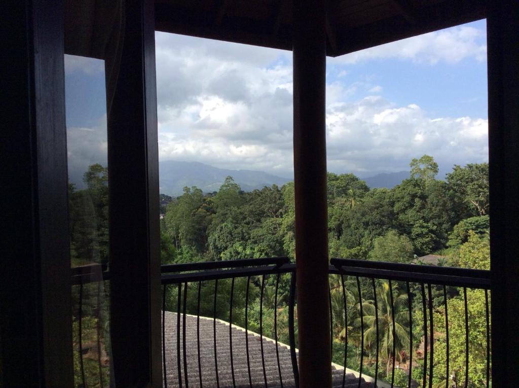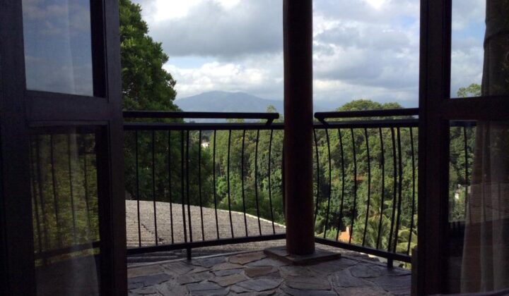 A balcony or patio that overlooks lush gardens or mountain views